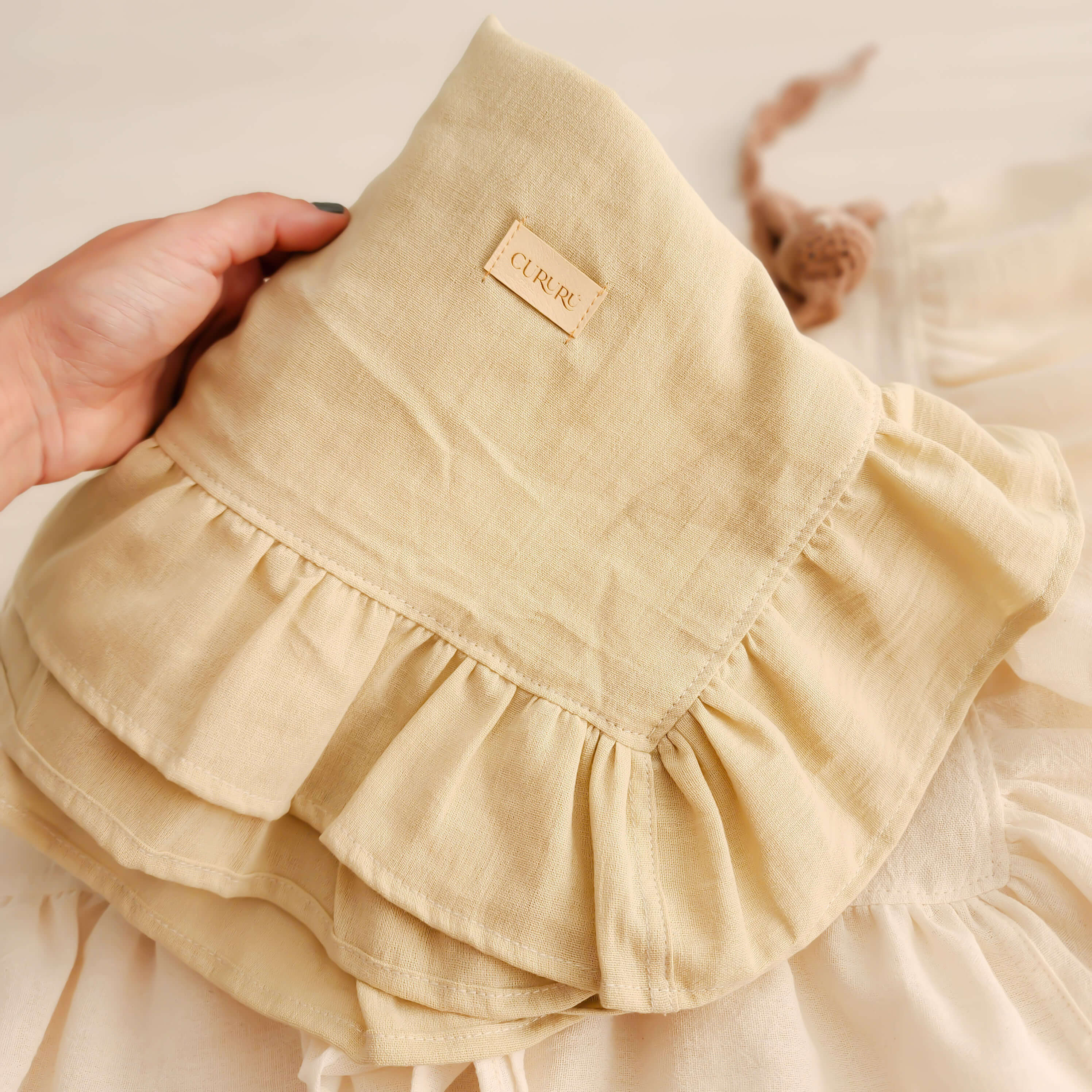 Nueva manta de muselina con terminación en volados. Una manta delicada, duradera y muy funcional.